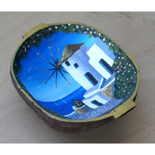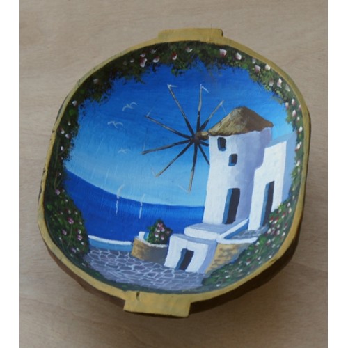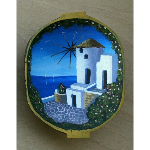 Νησιώτικο θέμα σε παλιά συντηρημένη σκάφη. Zωγραφική στο χέρι.