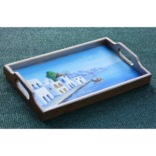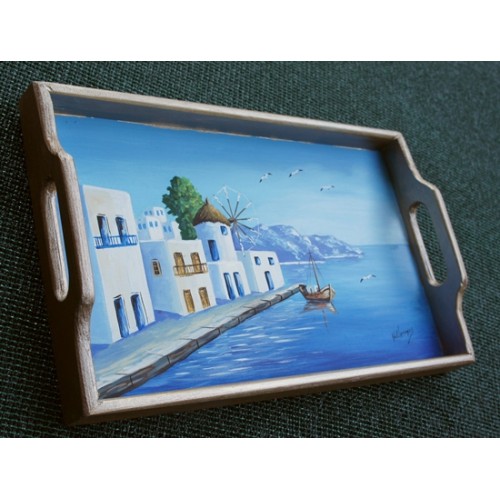 Νησιώτικο θέμα σε ξύλινο δίσκο. Zωγραφική στο χέρι.